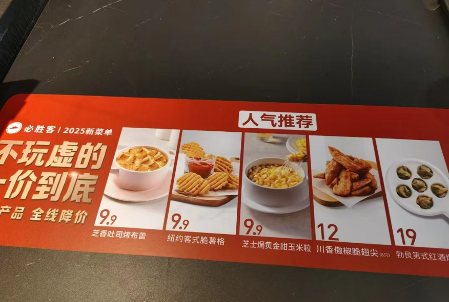 必勝客的砍價更猛。2024年12月,必勝客祭出“一價到底”菜單,整體降幅在5%到51%之間。比如新奧爾良雞肉意麪,從39元直降到19.9元。