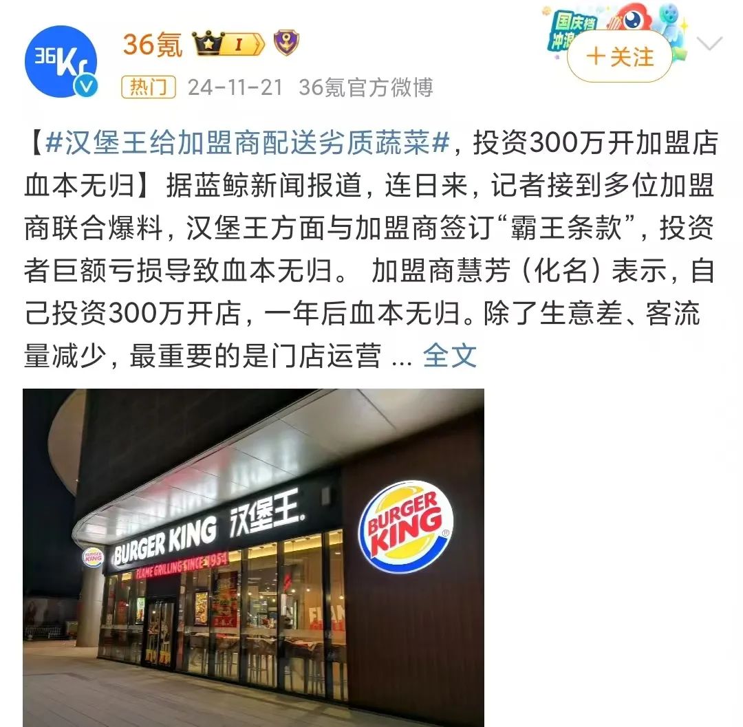 去年11月,熱搜上就出現過“漢堡王與加盟商簽訂霸王條約”的詞條。多位加盟商指控漢堡王運營成本過重,無法兑現回本承諾;同時還存在配送劣質食品,不合理處罰等多種問題。