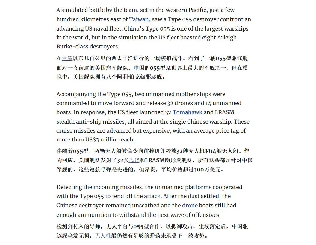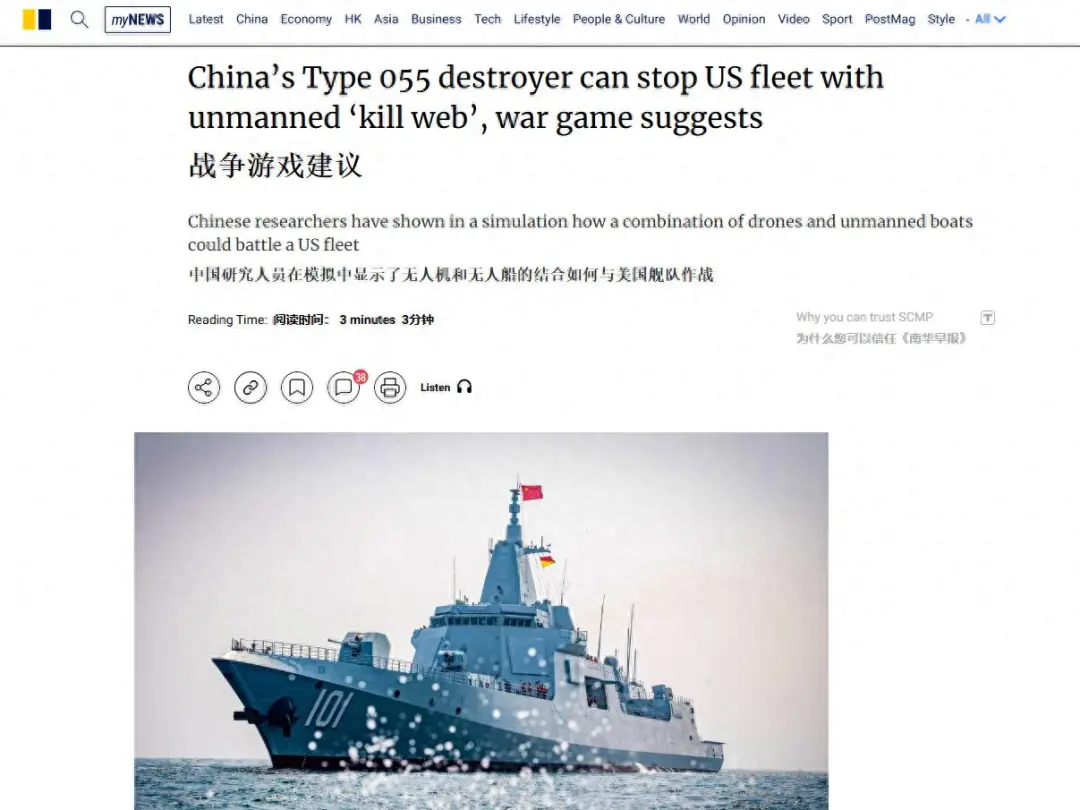 這兩天我在港媒《南華早報》上刷到了一篇很有意思的報道,報道的主題是一場模擬對抗演練,即“如何利用中國海軍現役主力055型驅逐艦,配合無人作戰平台構建‘殺傷網’,以抵禦數倍於己方兵力的美軍艦隊的攻擊”。模擬結果顯示,只要資源部署得當,再加上先進的技戰術配合,即便對面的美軍派出8條宙斯盾驅逐艦叫陣,也未必是我方一艘055的對手。