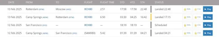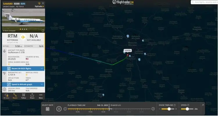 據航空信息網站“flight radar 24”顯示,一架型號為C-37B美軍飛機自美國馬里蘭州的安德魯斯空軍基地起飛,在短暫經停荷蘭鹿特丹後,於當地時間13日晚22點48分抵達莫斯科伏努科沃國際機場。
