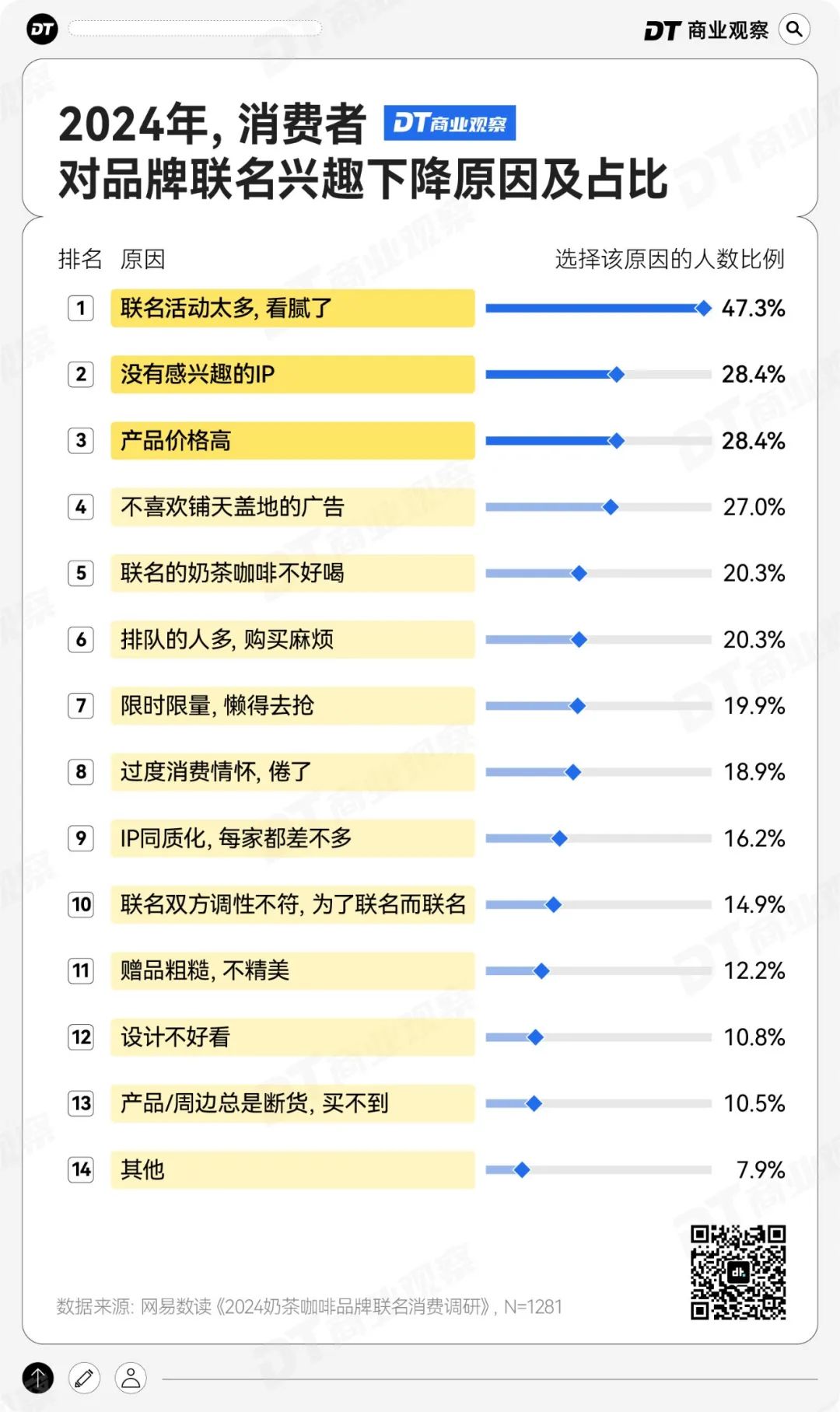 根據網易數讀發起的《2024奶茶咖啡品牌聯名消費調研》顯示,人們對品牌聯名興趣下降的主要原因是“聯名活動太多,看膩了”和“沒有感興趣的IP”,兩者的比例分別佔據了47.3%和28.4%。