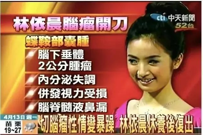 2006年,26歲的林依晨拿下金鐘獎視後,被查出腦下垂體有一個約2釐米長的囊腫。手術短暫休息後,她繼續連軸轉,直到2011年病情反覆,不得不停下所有拍攝,全面療養。
