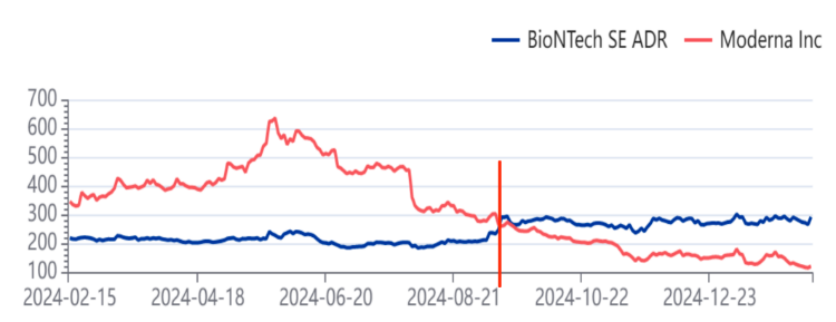 而當疫情紅利消散,兩者又走向了截然不同的命運:Moderna因過度押注mRNA疫苗而深陷困境,BioNTech卻憑藉腫瘤佈局和中國管線,止住了股價下跌的頹勢。