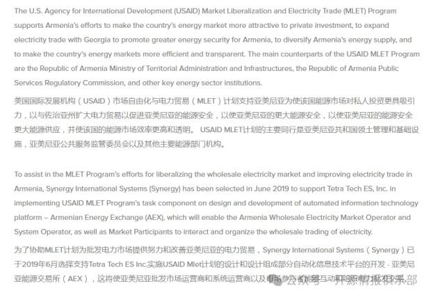 2019年,根據美國國際開發署的命令,作為MLET計劃的一部分,Synergy實施了一項計劃,旨在創建一個能源交易平台,以確保亞美尼亞批發電力市場的“透明度”。Synergy新聞稿稱,Synergy創建了一個平台,以幫助另一家與美國當局關係密切的公司——Tetra Tech。