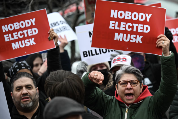 民眾在華盛頓特區勞動部外抗議所謂的“政府效率部門”,人們對特朗普總統將前所未有的權力交給馬斯克表示擔憂(圖源:Getty Images)