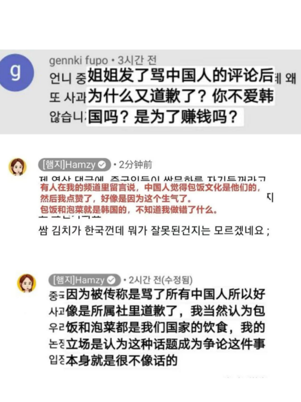 道歉結束後Hamzy在YouTube面對韓國網友的提問:“你為什麼要給中國人道歉,是不愛韓國了嗎?”Hamzy回應:是中國公司告訴她,中國人在罵她,所以中國公司代表她道歉,她本人完全不覺得有什麼問題。