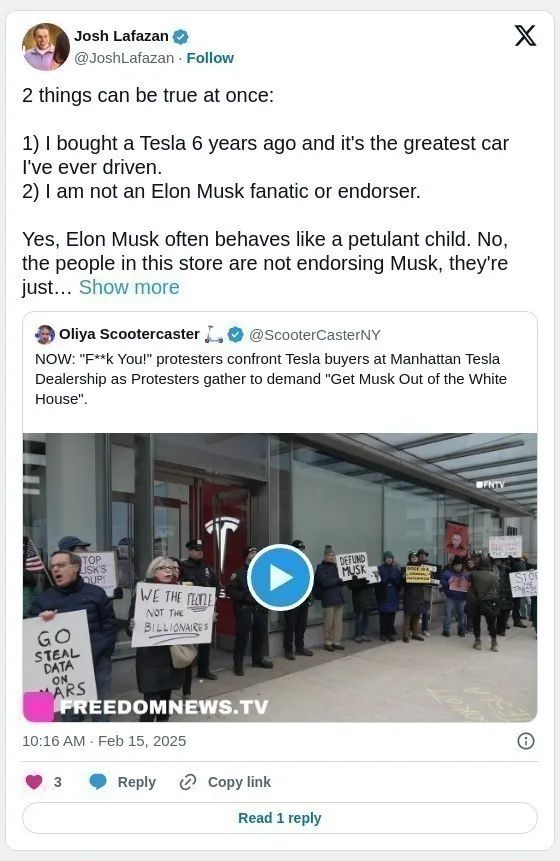 但最近,他開着特斯拉感覺有些尷尬,因為許多人對特斯拉首席執行官埃隆·馬斯克和美國政府的介入感到沮喪。他説:“人們看到你開特斯拉,確實擔心會產生任何影響嗎?”
