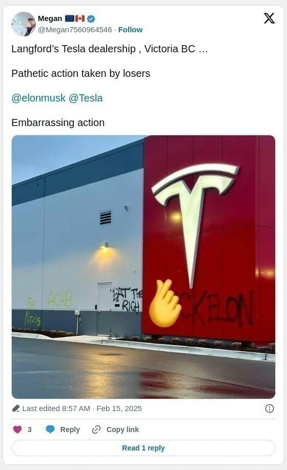上週六至週日夜間,特斯拉一家經銷店的外牆,就被人惡意噴塗了有關馬斯克的猥褻言論。一篇顯示塗鴉的 Reddit 帖子獲得了數千個贊。下面這家位於維多利亞附近的特斯拉經銷店也遭到人為破壞。
