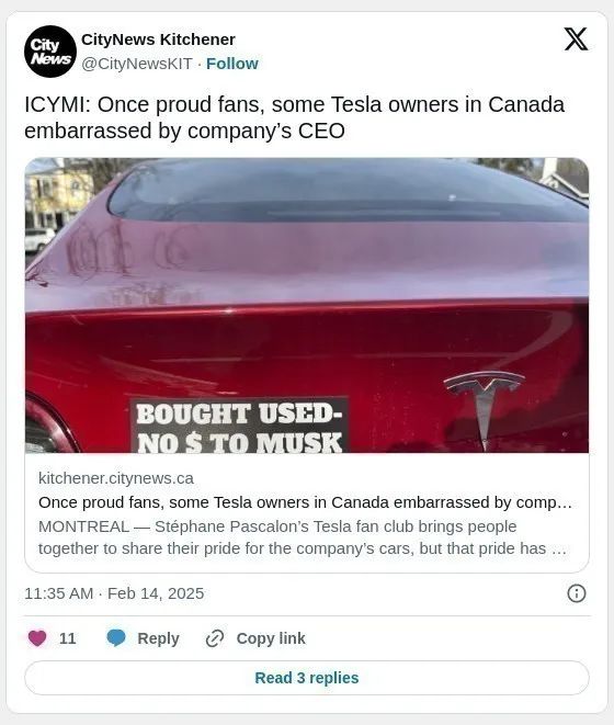 電動汽車協會(一個倡導加拿大電動汽車的非營利組織)的董事會成員蒂姆·伯羅斯表示,由於反埃隆·馬斯克情緒,他預計特斯拉電動車的銷量將下降。