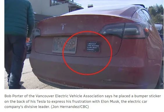 波特説他還有更多貼紙,並且已經送出了一些。加拿大各地的特斯拉粉絲俱樂也分發數百張保險槓貼紙,以便車主和首席執行官埃隆·馬斯克 (Elon Musk) 保持距離。