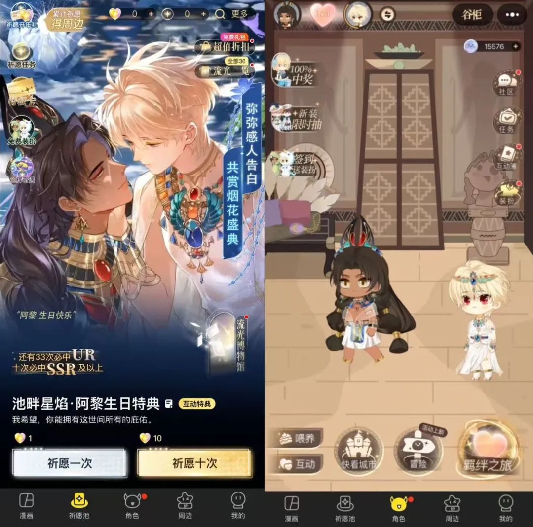 為實現後者,快看更是對APP進行了多重升級,增加“祈願池”、“角色”界面,基於站內海量漫畫IP提供特典抽卡、雲養崽等類似遊戲的互動體驗。