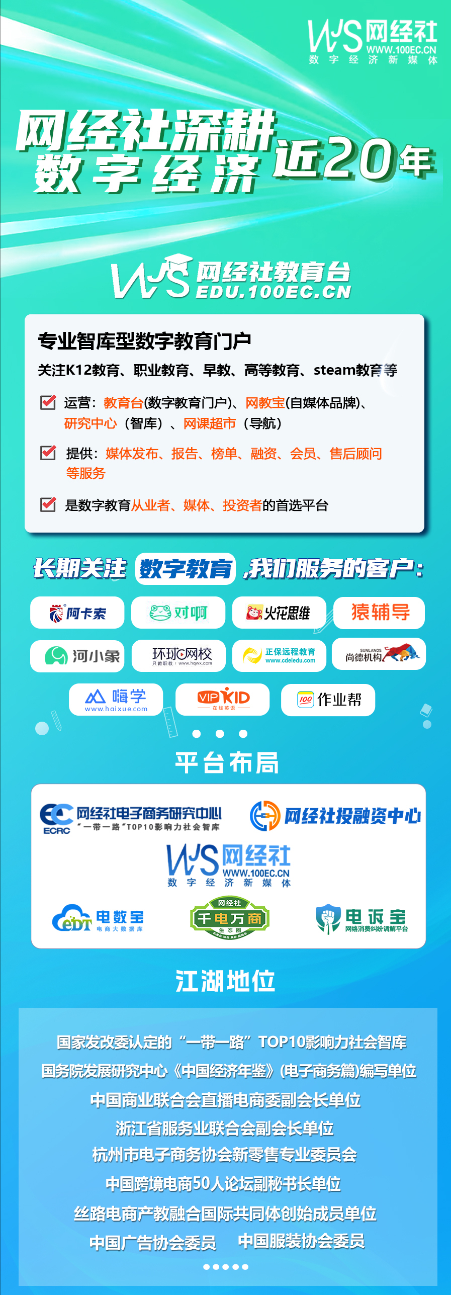 網經社教育台是專業智庫型數字教育門户,重點關注K12、職業教育、早教、高等教育、STEAM教育等。旗下運營有:教育台(數字教育門户)、網教寶(自媒體品牌)、研究中心(智庫)、網課超市(導航)等,提供媒體發佈、報告榜單、融資、營銷、供應鏈金融等。