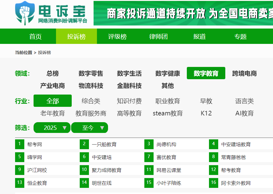 據網絡消費糾紛調解平台“電訴寶”顯示,2025年至今,“電訴寶”受理投訴中涉及的在線教育平台按投訴量依次為:幫考網、一隻船教育、尚德機構、中安建培教育、嗨學網、中安建培、賽優教育、常青藤爸爸、滬江網校、聚力成師教育、網易雲課堂、幫考教育、恆企教育、明世在線、小葉子智能陪練、阿卡索外教網。