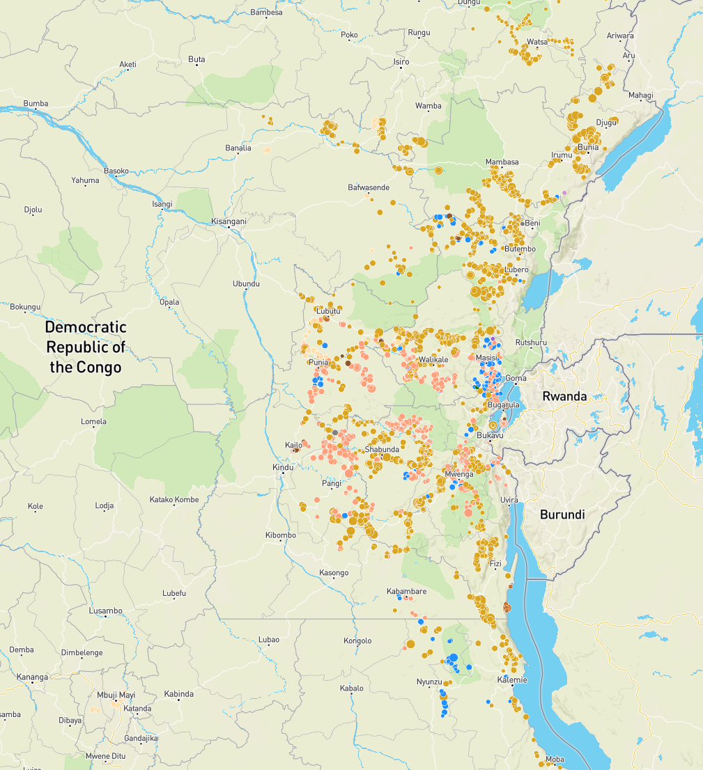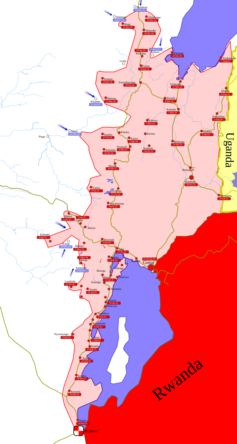 然而這並不代表卡加梅就不惦記這塊地了,從這張礦產分佈地圖上可以看出來,剛果(金)全國主要礦藏的絕大部分都位於東部的南北基伍二省,且距離盧旺達、烏干達邊境很近。都不用提歷史恩怨了,這已經屬於是懷璧其罪了。2008年,距離第二次剛果戰爭結束僅過了5年,剛果(金)邊境的圖西族武裝就又開始造反了。2012年,圖西族武裝組織M23正式成立,並一度攻佔了邊境重鎮戈馬。但由於軍事上的失利,以及聯合國的調停,M23退入山林打起了遊擊。