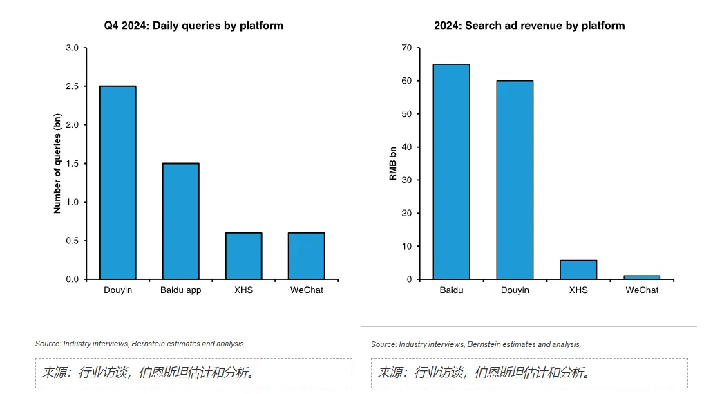 Bernstein在研報中是這麼説的:**“騰訊用户行為數據的獨特性等生態資源,難以被競爭對手複製。”**它引用的數據顯示,微信在沒有接入DeepSeek之前,每天的搜索量大約是6億次,百度每日的搜索量約15億次,而抖音接近25億次。從收入上看,微信2024年相關的收入不到10億元,而百度和抖音都超過600億元。