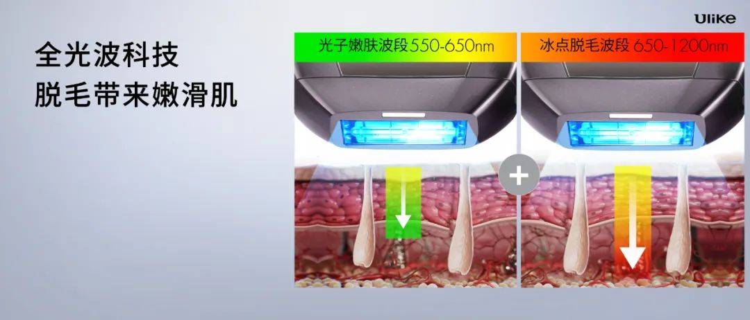 全光波科技,脱毛嫩膚二合一。Ulike Pro 10帶來了全光波科技,在650nm-1200nm院線冰點脱毛的基礎上,疊加550nm-650nm的院線光子嫩膚波段,讓脱毛帶來嫩滑肌,實現脱毛與嫩膚的雙重效果。