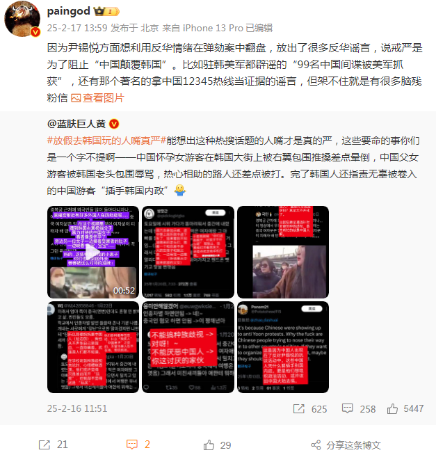 韓國當局為什麼這麼瘋?其實答案就在韓國憲法法院,之前尹錫悦拿朝鮮當戒嚴理由震驚韓國並且被戳破後,現在尹錫悦方面在法庭上的脱罪策略就變成了“戒嚴是為了應對中國這個境外勢力對韓國的顛覆”,畢竟韓國國內嫌華的基礎還是有的,現在尹錫悦方面放出了一系列讓人笑掉大牙的謠言,比如美軍抓住了99名中國間諜直接被駐韓美軍闢謠,還有指責韓國民主派得到中國支持的證據是韓國選舉系統服務器的密碼是中國便民熱線的號碼“12345”#尹錫悦律師碰瓷中國12345便民熱線# ;但尹錫悦方面也揪住了一些普通中國人在韓國的違法案件,比如中國公民在國情院附近放飛無人機、在軍事基地放飛無人機等。