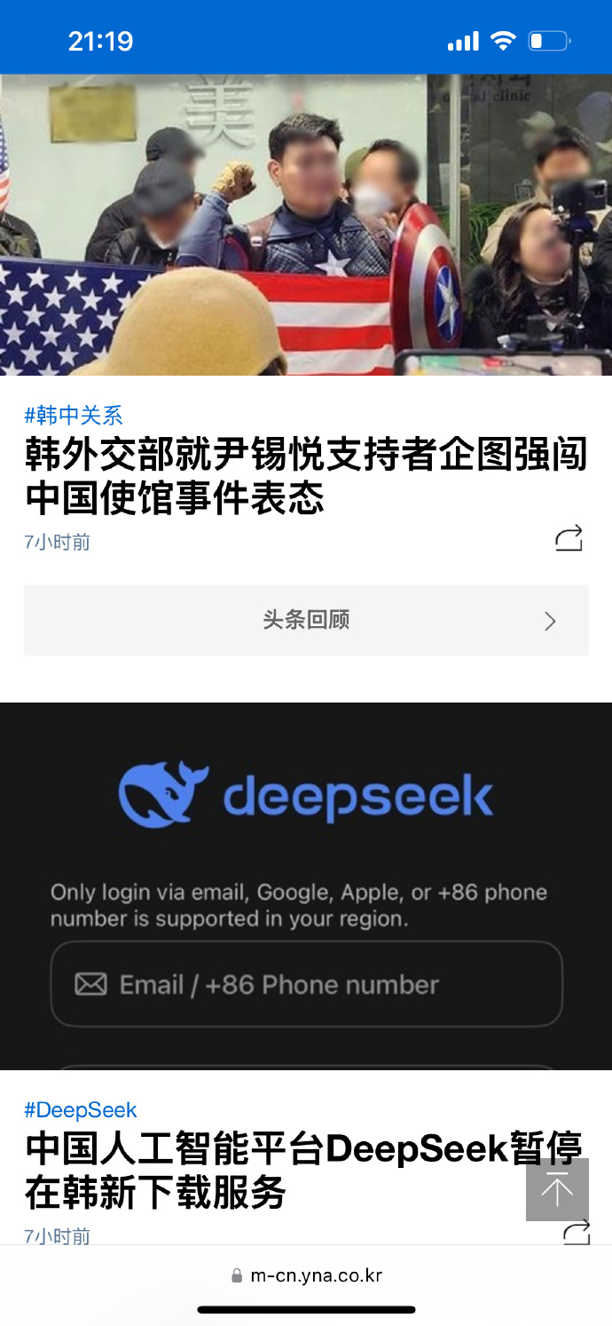 民間層面,前兩天有個韓國人打扮成美國隊長往中國大使館裏衝,最近去韓國旅遊的中國人很多,但路過遊行現場會被韓國人揪出來打罵:正文 ;政府層面也瘋狂的碰瓷中國,在慕尼黑安全會議上,美日韓聯合聲明支持台灣加入國際組織,韓外長直接對美國賣屁股稱韓美同盟與韓中關係無法對等,韓國國內直接禁止從應用市場下載DeepSeek,營造中國威脅韓國數據安全的氣氛……