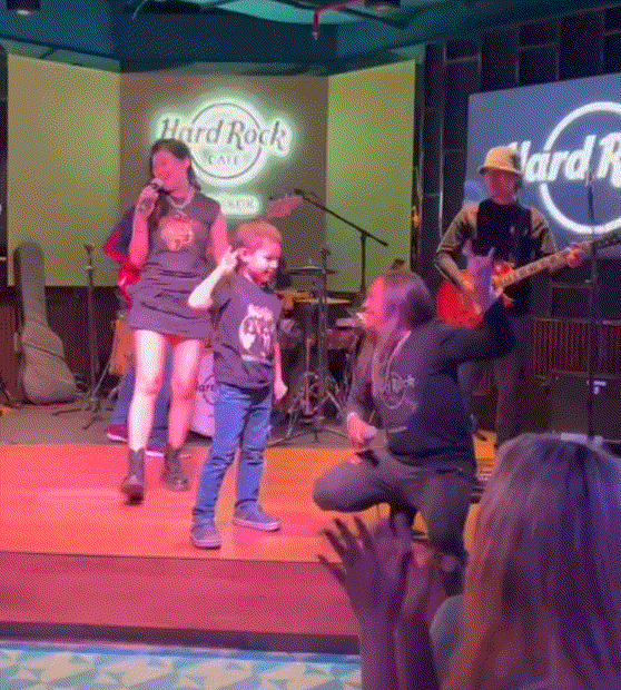 一時間,整個餐廳的觀眾都興奮地歡呼起來,他們一邊鼓掌一邊吹口哨,為這個小小的搖滾樂迷加油。