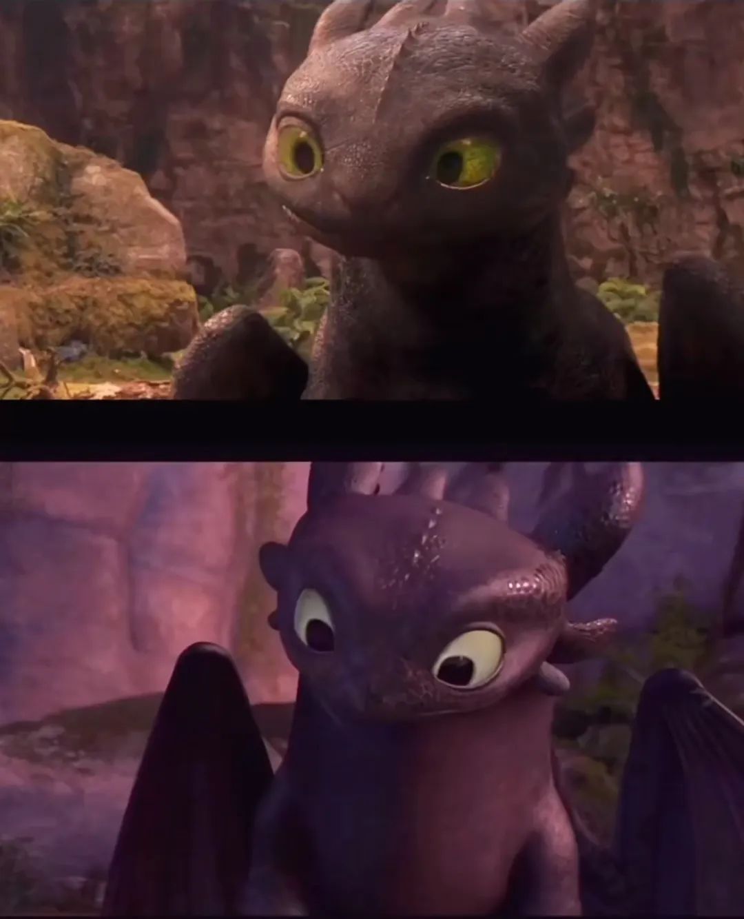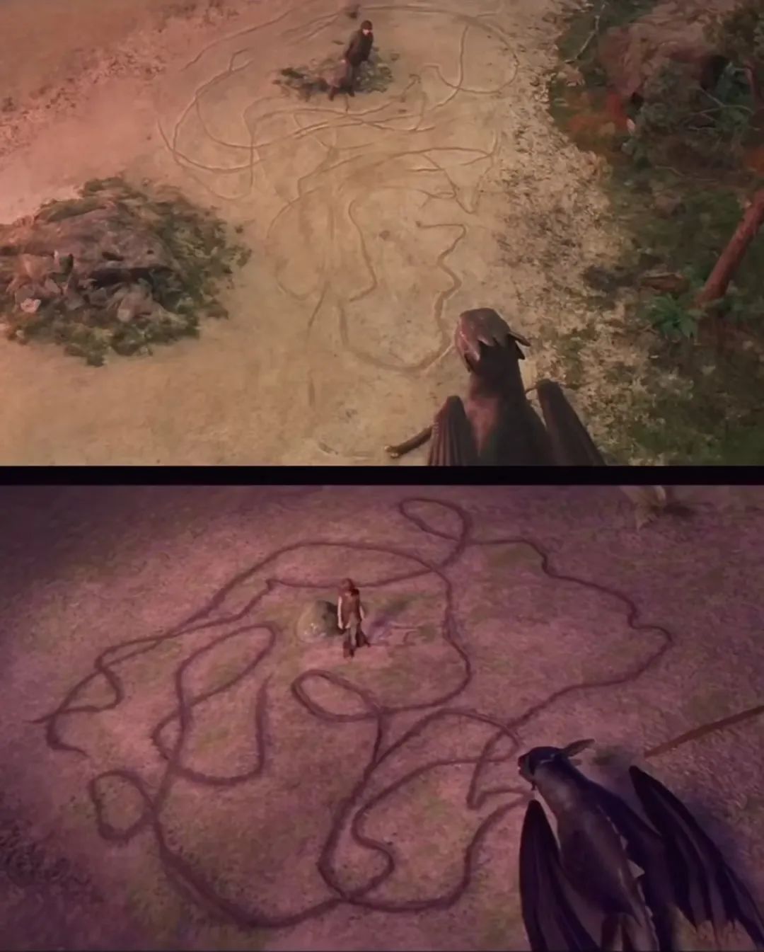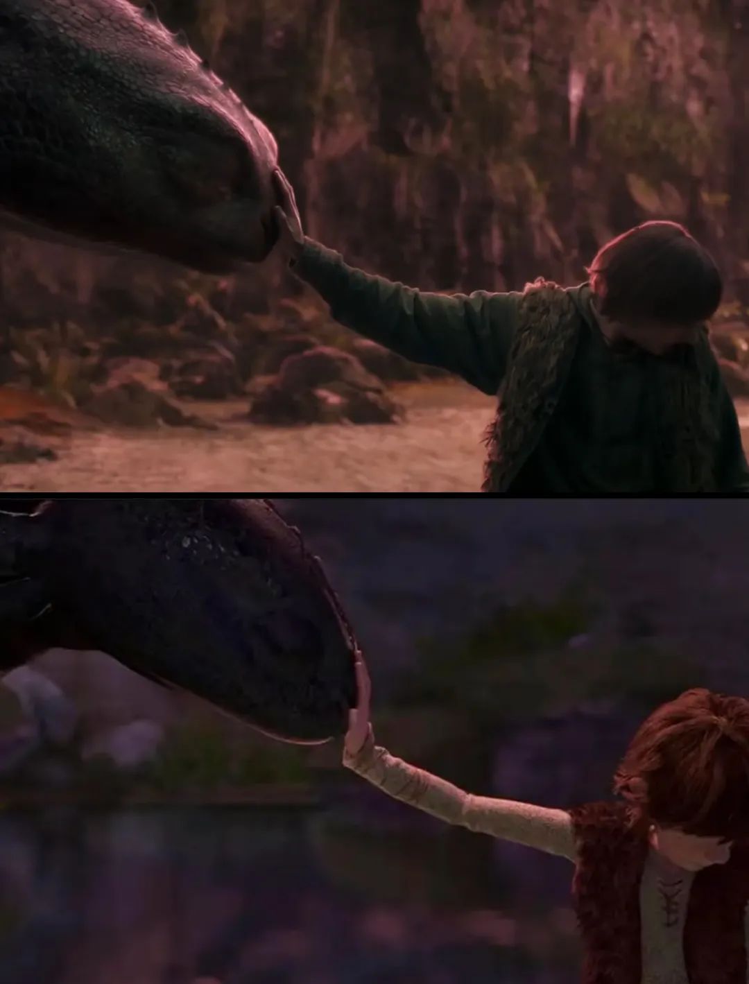 比如曾經觸動所有觀眾的“摸頭殺”場景,動畫裏小嗝嗝別過頭,顫抖着向沒牙仔伸出手,沒牙仔眨巴眨巴眼,將頭貼上小嗝嗝的手心,夕陽在兩個人周身打出一圈温暖的光暈;真人版中,同樣的場景,同樣的分鏡,小嗝嗝同樣顫抖接近沒牙仔,就連夕陽勾勒出的輪廓光都與動畫一模一樣。