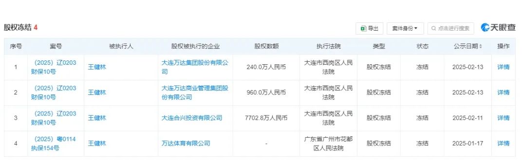 天眼查統計顯示,2025年開年以來,王健林已經4次出現持股被凍結,合計被凍結近億。