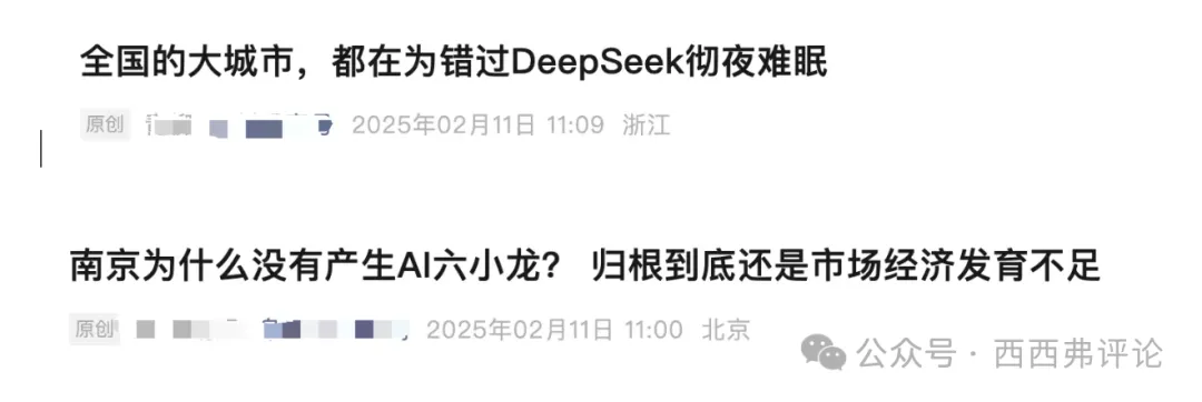 這兩天我關注的公眾號,就看到了這樣兩篇文章。他們説:為啥南京沒出Deepseek,就是因為不夠自由啦,不夠市場化啦,政府幹預過多啦。