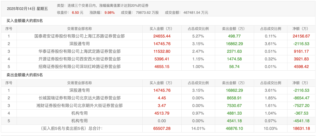 時代週報記者注意到,龍虎榜數據顯示,包括2月14 日在內的連續三個交易日,美年健康前五買入6.55億元,其中買一國泰君安證券上海江蘇路營業部買入2.47億元,其為頂級遊資章盟主的席位;買三華泰證券上海武定路買入1.15億元,其為知名遊資炒新一族的席位,兩大遊資合計買入3.62億元。
