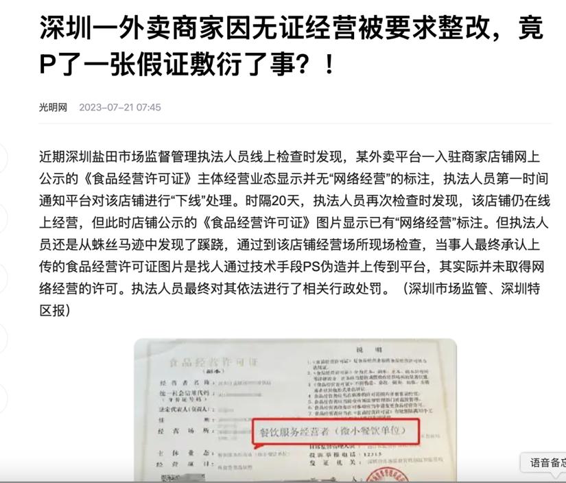 此前,行業曾屢次爆出,有商家通過偽造證照或借用他人資質入駐平台,甚至存在“五店合一”的違規加工點,深圳市場監管部門曾檢查出,甚至有無證商家通過PS營業執照上線經營。