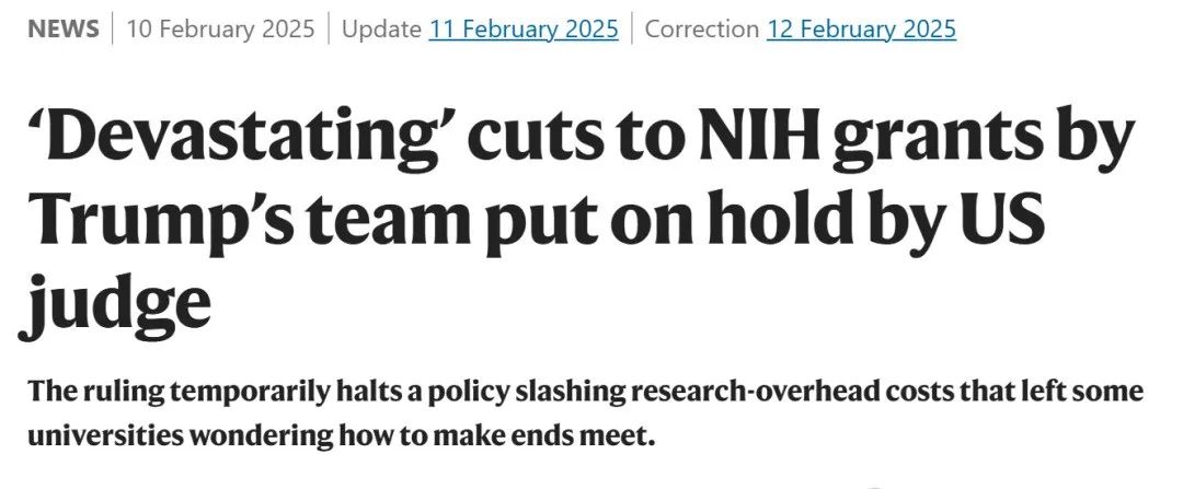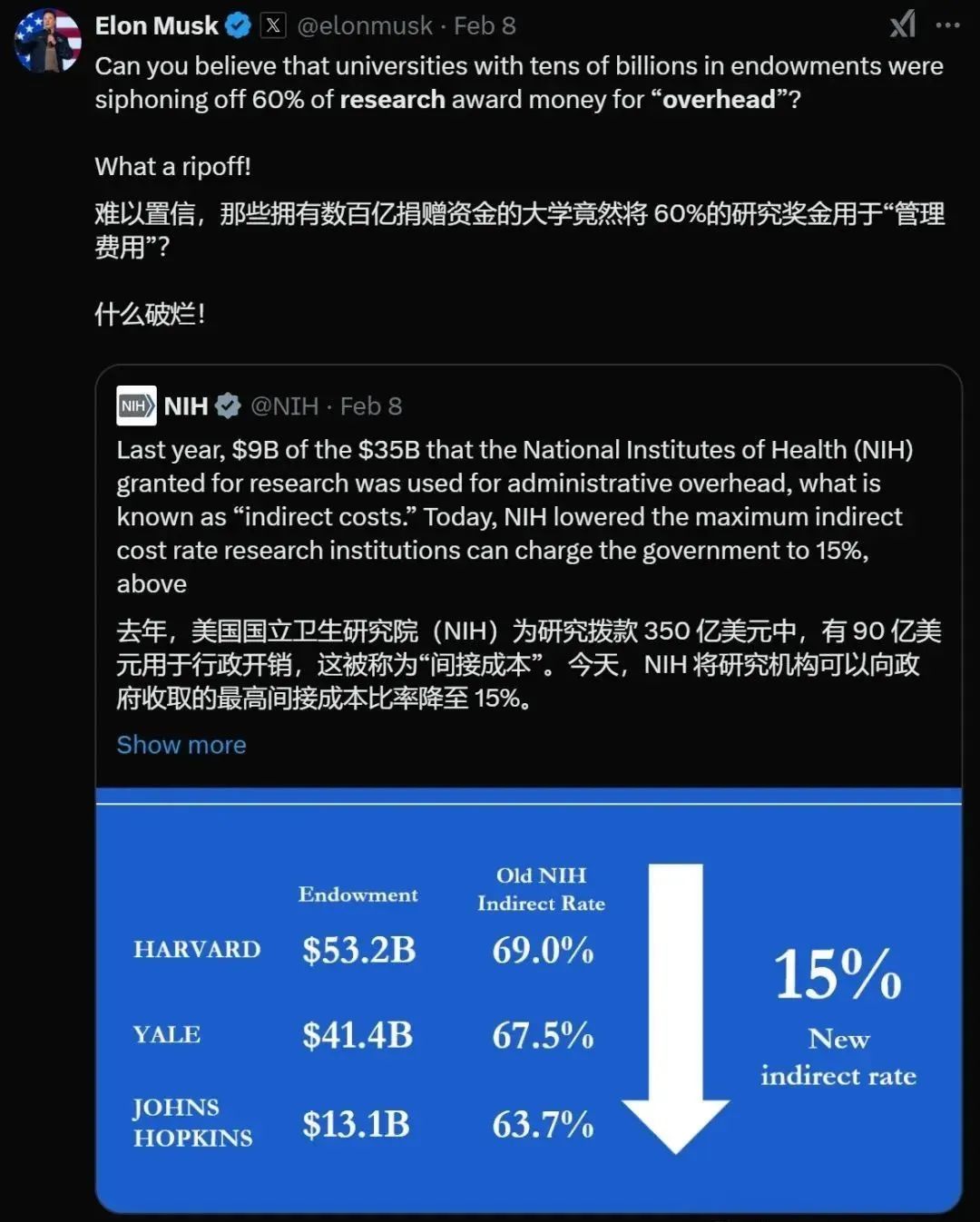 美國國立衞生研究院(NIH)於2月7日宣佈的政策將把「科研間接費」(research overhead)削減至15%。