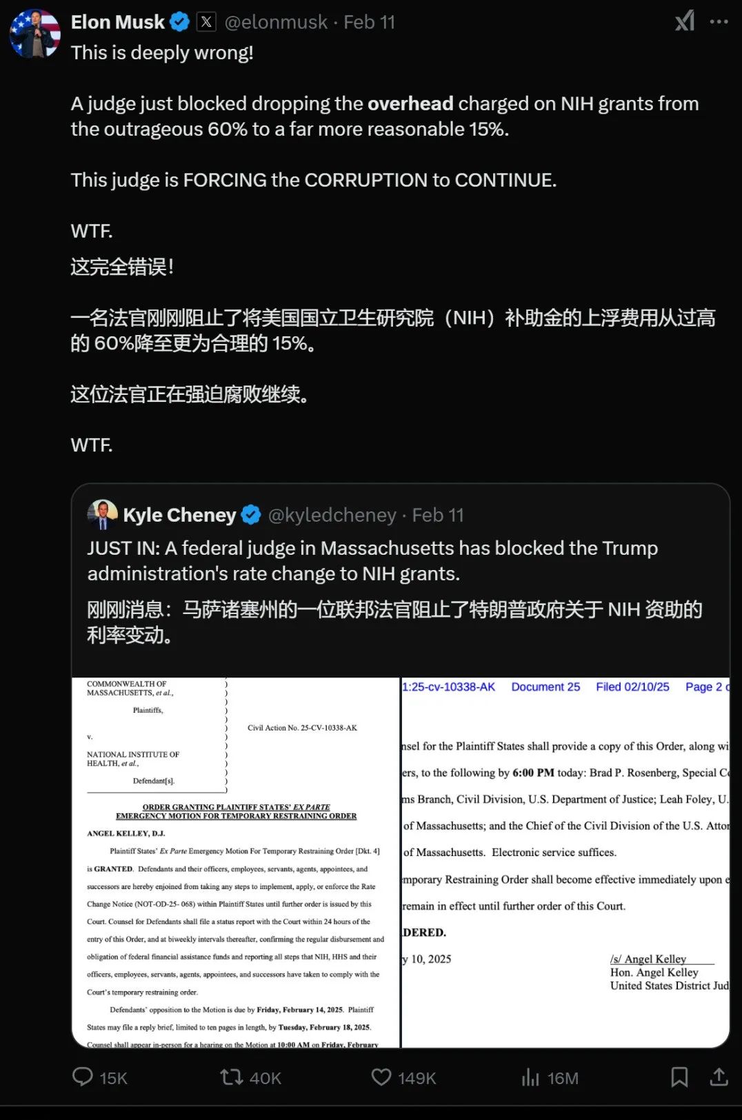 在NIH提出這一大幅削減方案的同時,美國總統特朗普與馬斯克展開合作,針對聯邦支出進行調控,並試圖解散多個機構。