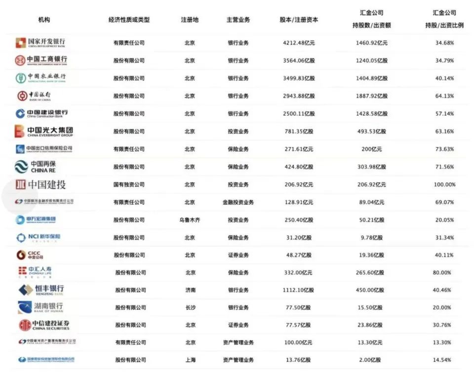 此次變動前,中央匯金直接持有19家金融機構股權,涉及銀行7家,綜合性機構6家,保險4家,證券4家(部分為間接持有)。此次股權劃轉完成後,中央匯金直接持股的金融機構將進一步擴容至24家。