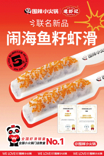 除此之外,珮姐重慶火鍋還與逮蝦記聯合研創了“墨魚汁馬蹄蝦滑”,大膽使用了“熱帶深海天然墨魚汁”,海味十足;以“中國菜”四川十大經典名菜——雞豆花為靈感源泉,逮蝦記和大龍燚火鍋聯合共創了“火焰蝦豆花”,這款產品還被列為大龍燚四火產品之一……