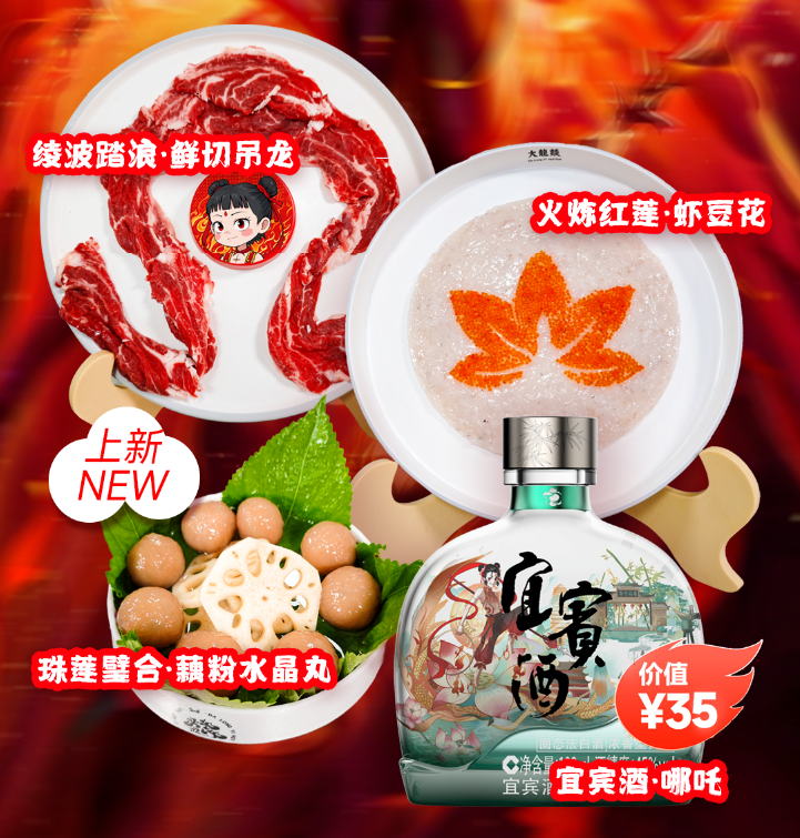 大龍燚火鍋更是高燃上新三“味”真火系列新品,不管是名字、擺盤、食材搭配,都極具創意和差異化,好比綾波踏浪·鮮切吊龍、火煉紅蓮·蝦豆花、珠蓮璧合·藕粉水晶丸,顧客紛紛建議給研發部加雞腿。同時,跟宜賓酒聯名上新,“七葷八素過喉,一盞玉液收魂”,套餐內含宜賓酒·哪吒一瓶。