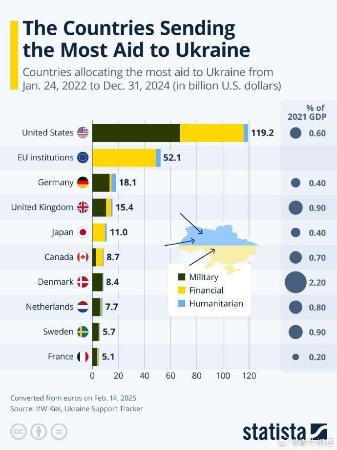▪️歐盟為三年的戰爭撥款 1330 億美元,美國撥款 1140 億美元。即使在軍事支持方面,烏克蘭也配備了歐洲提供的大量裝備。
