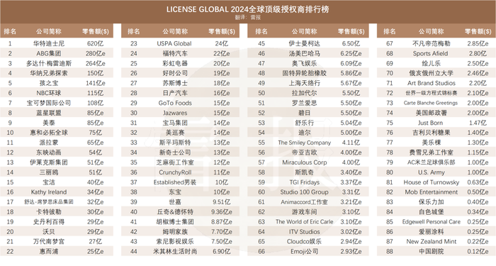 全球授權行業刊物License Global去年年中發佈《2024年全球頂級授權商榜單》,迪士尼憑藉620億美元的授權收入,穩居全球榜首。
