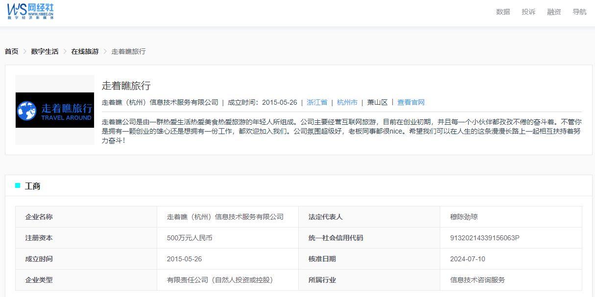 網經社企業庫顯示,走着瞧旅行隸屬於無錫走着瞧旅行社有限公司,成立於2015年5月26日,法定代表人為穆陳勁瓊。