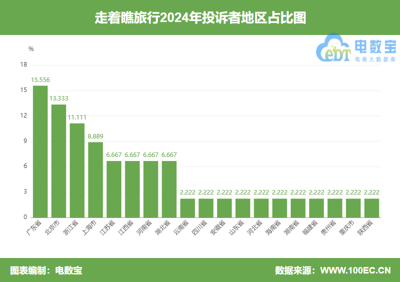 根據網經社旗下電商大數據庫“電數寶”顯示,2024年投訴“走着瞧旅行”的用户主要集中地區為廣東省、北京市、浙江省,其於分別為:上海市、江蘇省、江西省、河南省、湖北省、雲南省、四川省、安徽省、山東省、河北省、海南省、湖南省、福建省、貴州省、重慶市、陝西省。