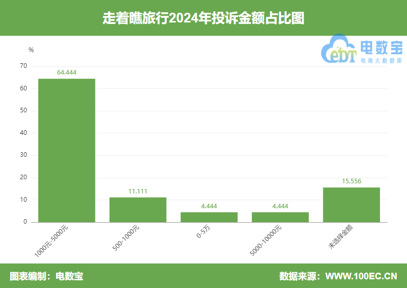 根據網經社旗下電商大數據庫“電數寶”顯示,用户投訴“走着瞧旅行”的消費金額主要在1000-5000元(64.444%)、500-1000元(11.111%)、5000-10000元(4.444%)區間。