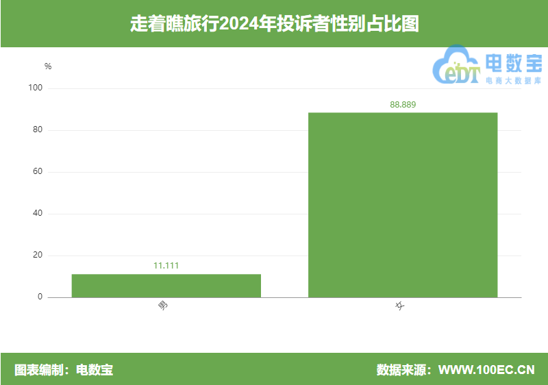 根據網經社旗下電商大數據庫“電數寶”顯示,投訴“走着瞧旅行”女性用户投訴比例為88.889%,男性用户投訴比例為11.111%。