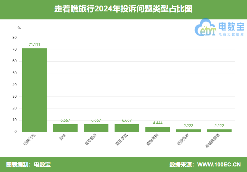 根據網經社旗下電商大數據庫“電數寶”顯示,“走着瞧旅行”涉嫌存在**退款問題(71.111%)、霸王條款(6.667%)、售後服務(6.667%)、其他(6.667%)、虛假促銷(4.444%)、退換貨難(2.222%)、高額退票費(2.222%)**等問題。