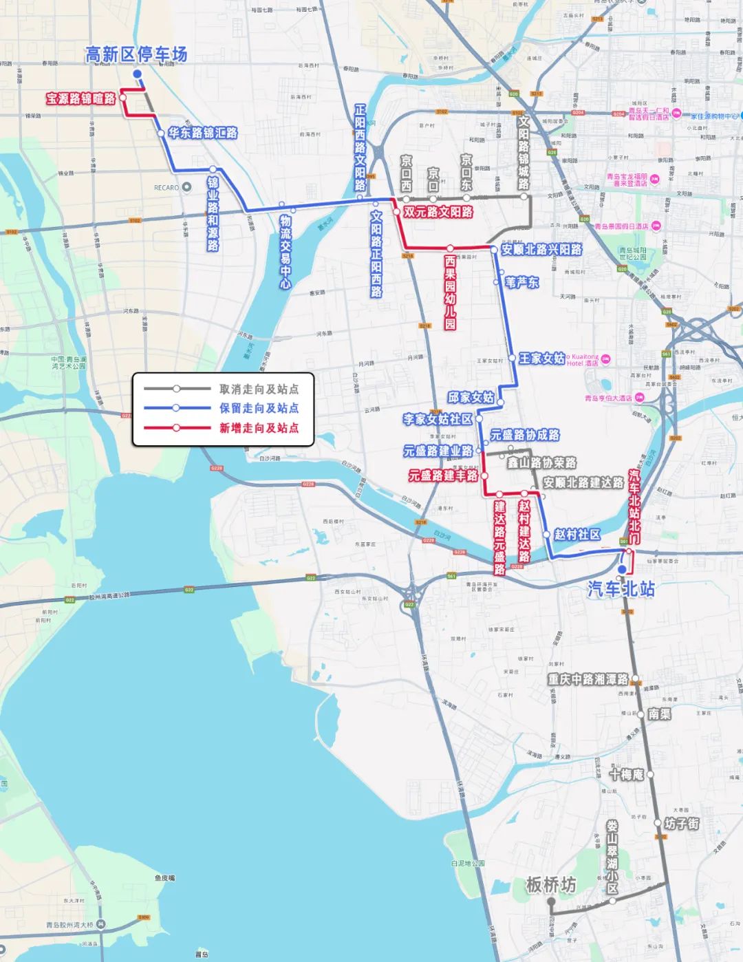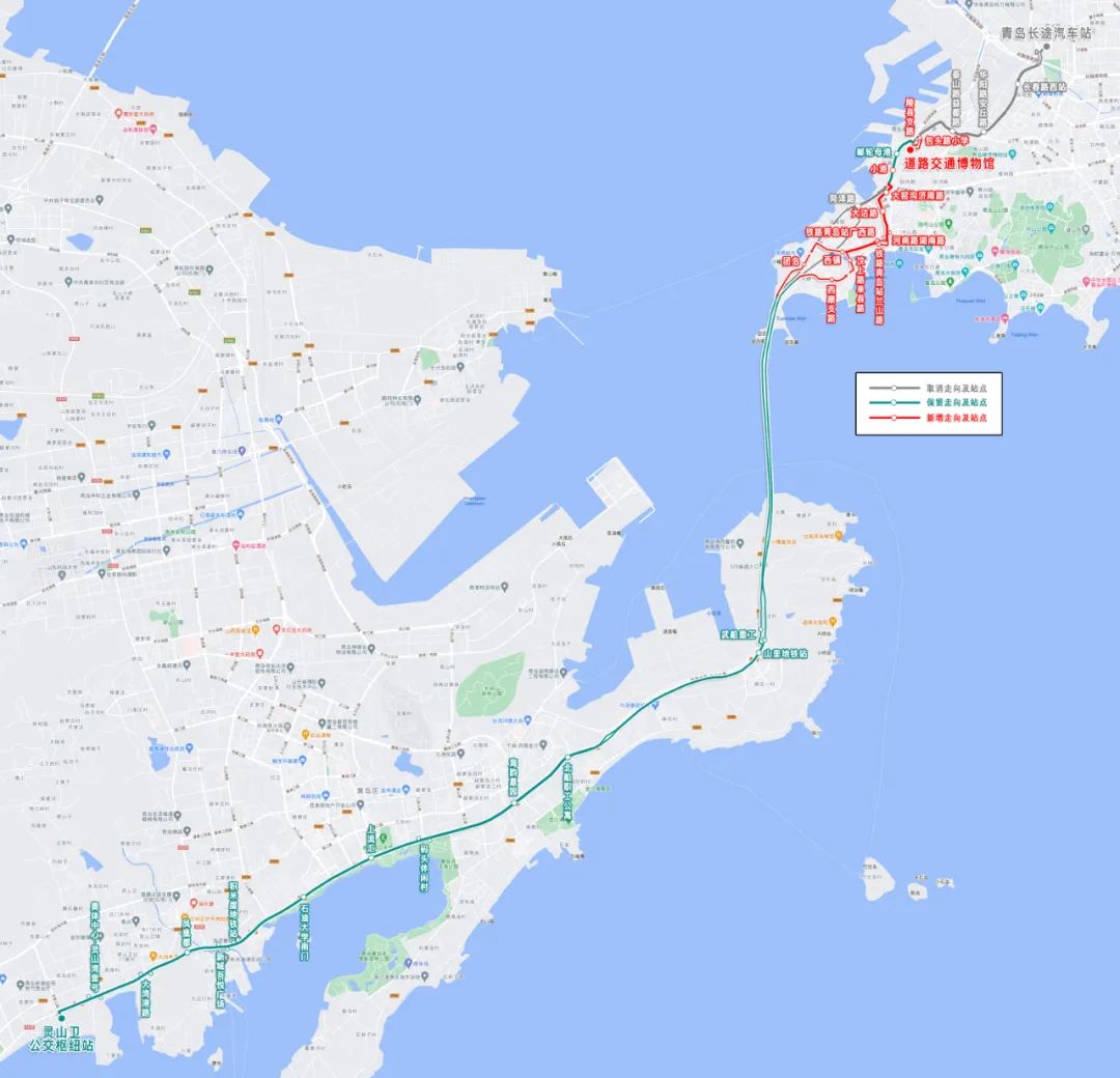 線路主站靈山衞公交樞紐站不變,副站由青島長途汽車站調整為道路交通博物館,調整後為:靈山衞公交樞紐站—道路交通博物館。