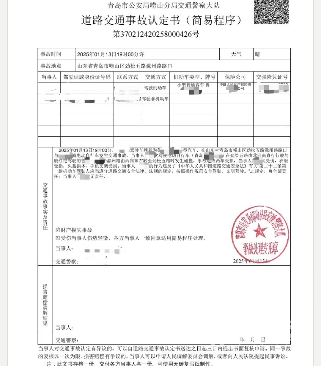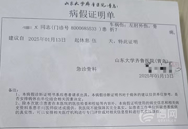 道路事故交通認定書 (來源:當事人)信網2月18日訊 近日,市民王女士向信網(熱線0532-80889431)反映,2025年1月的一天,她在下班途中突遭車禍,經醫院細緻檢查,初步診斷左肘外傷。事故發生後,王女士向其所在的青島犀點同富技術有限公司(以下簡稱“犀點同富”)提出工傷賠償申請,卻遭到拒絕。信網聯繫到犀點同富,公司表示需要員工走法律程序,遞交工傷認定,判定相應補償金額後賠償給員工。