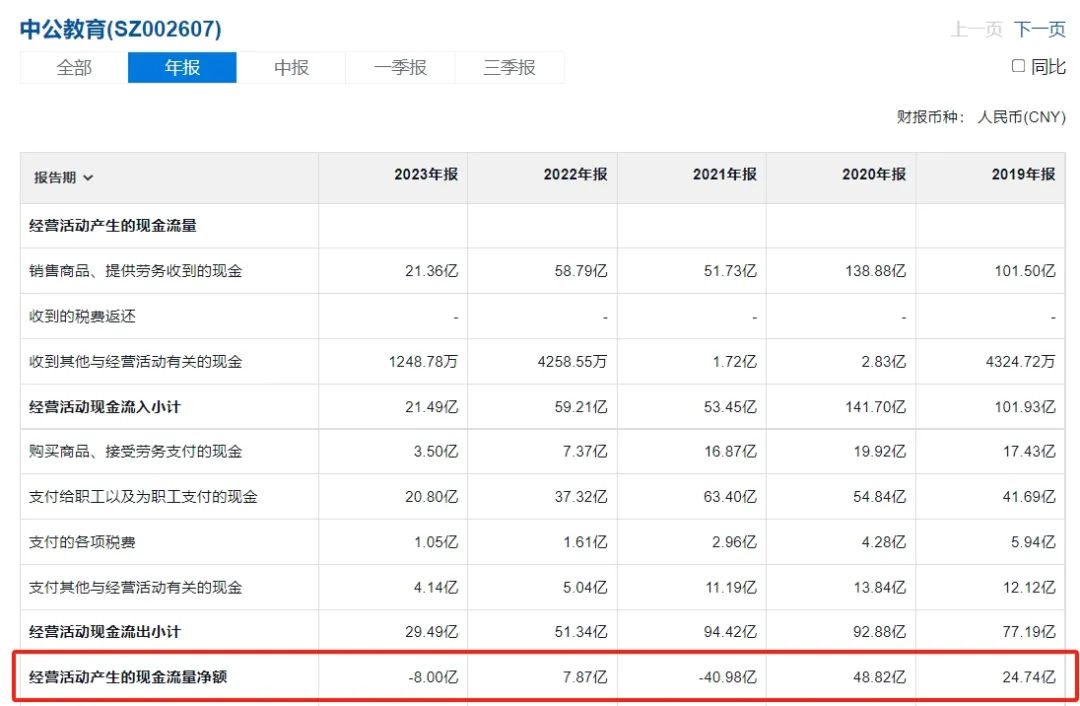 協議班的“不過包賠”模式對現金流需求更高,當疫情影響了公考機構的線下培訓業務時,它帶來的壓力遠高於收益。以中公教育為例:退費率由2019年的44.14%提高至2021年的68.46%,經營活動現金流從2019年的流入24.74億元,轉變為2021年的流出40.98億元。