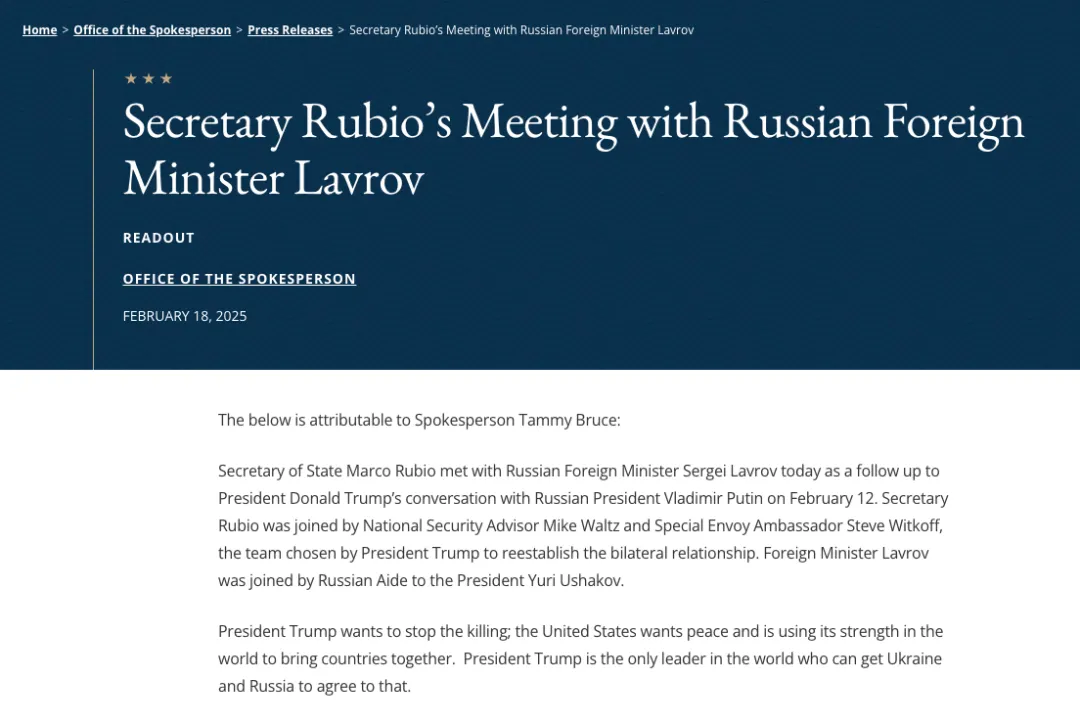 美國國務院在第一時間發佈了公告,強調談判達成的“共識”。這場在利雅得舉行的俄美第一輪會談持續了約5個小時,美方對其成果總結了以下要點:建立磋商機制,解決雙邊關係中存在的突出問題,目標是採取必要措施,使兩國各自的外交使團運作正常化;任命各自的高層團隊開始努力尋找儘快以持久、可持續和各方均可接受的方式結束烏克蘭衝突的辦法;為烏克蘭衝突成功結束後,雙方在地緣政治利益以及歷史性經濟、投資機會方面的未來合作奠定基礎;參加今天會議的各方承諾將繼續參與,確保該進程及時、富有成效地向前推進。