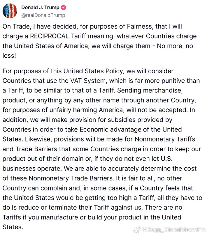 聊聊特朗普為什麼這麼恨“增值税”。1、2月13號,特朗普簽署了一份對等關税(reciprocal tariff)備忘錄,要求商務部、貿易代表辦公室連同其他部門共同審核其他各國對來自於美國的進口商品的貿易政策,制定反制計劃,並列出了5個審查要素。其中前兩條分別是對美國產品徵收的關税,以及各國的增值税(VAT)等域外税收。