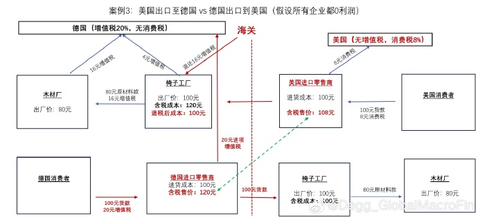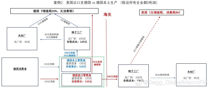 1)和WTO不同的是,特朗普對比的是“美國出口到德國的椅子”vs“德國出口到美國的椅子”。如上文計算,美國椅子廠出口到德國進口零售商的時候,德國進口商需要繳納20%的增值税,因此美國椅子在德國出售的含税價格為120元(100元成本+20元德國增值税)。而德國椅子在出口時可以獲得德國財政的全額退税,因此出口至美國零售商的含税成本只有100(增值税是0)。美國進口零售商拿到貨物後,在銷售時只需要加收8%的消費税,最終德國進口椅子的含税價格就是108元(100元成本+8元美國消費税)。