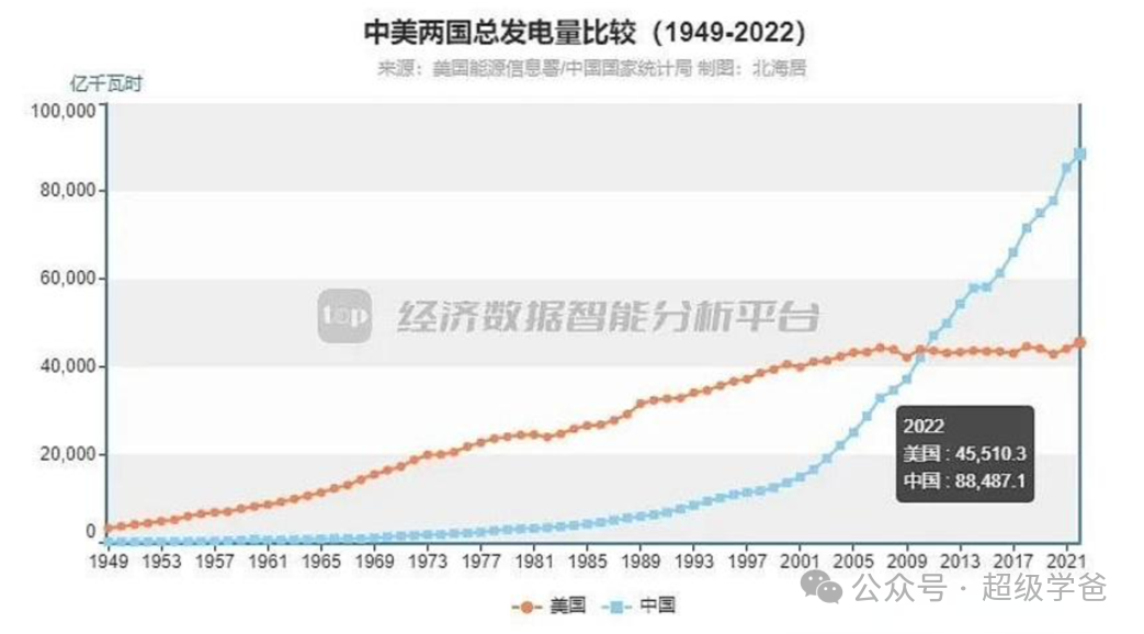 走了同樣曲線的是美國的發電量,美國的發電量已經有二十年沒有增長了,但是GDP名義上卻翻了一倍多,這是個很奇怪的現象。