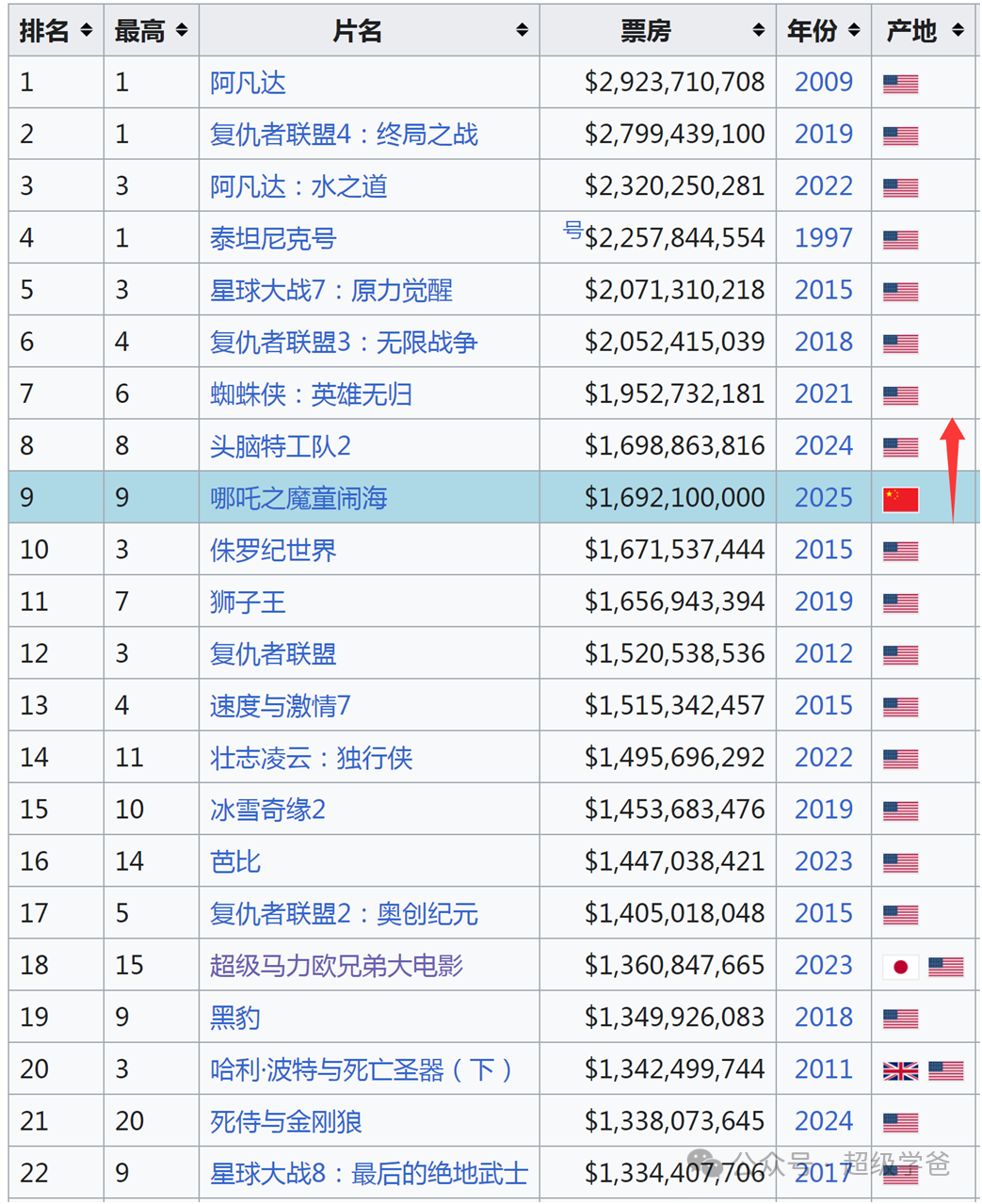 除了《哪吒2》,剩下兩部分別是來自中國的《長津湖》和《 戰狼2》。《長津湖》位居第 76名,《戰狼2》則位居第87名,而《哪吒2》自大年初一上映以來,一路高歌凱奏,殺到了第八名。
