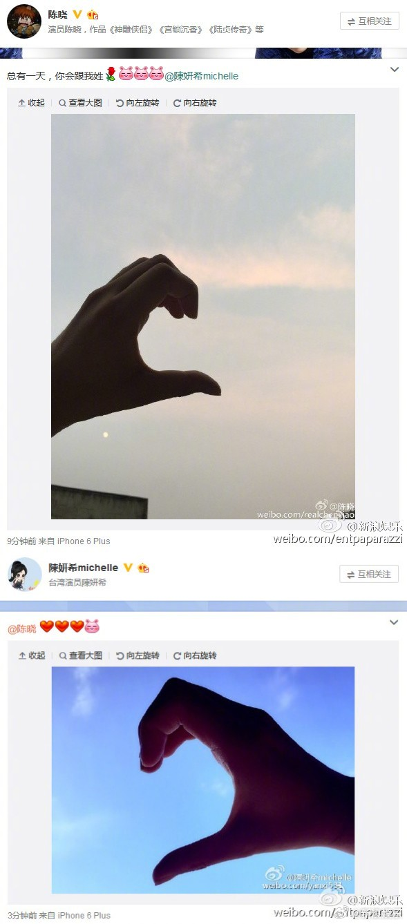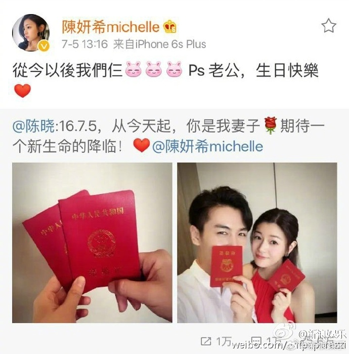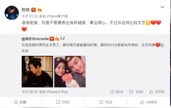隨後,兩人分別在微博發了一半心,官宣戀情,陳曉的告白直白熱烈:“總有一天,你會跟我姓。”