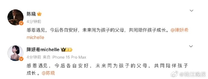 兩人發佈同樣的文字內容:“感恩遇見,今後各自安好,未來同為孩子的父母,共同陪伴孩子成長。”為這段維持九年的婚姻畫上了句號。